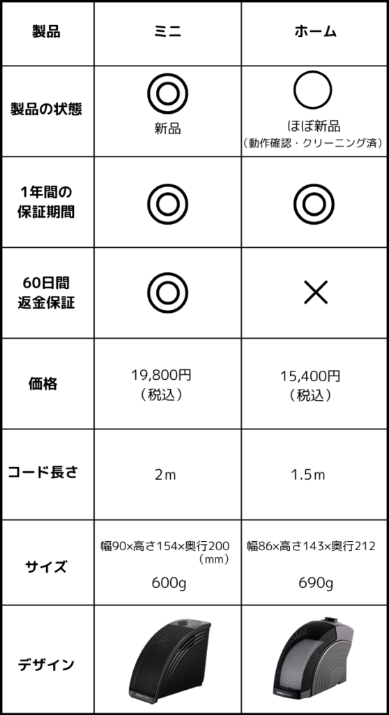 ミニとホームの違いは下の表のようになっています。